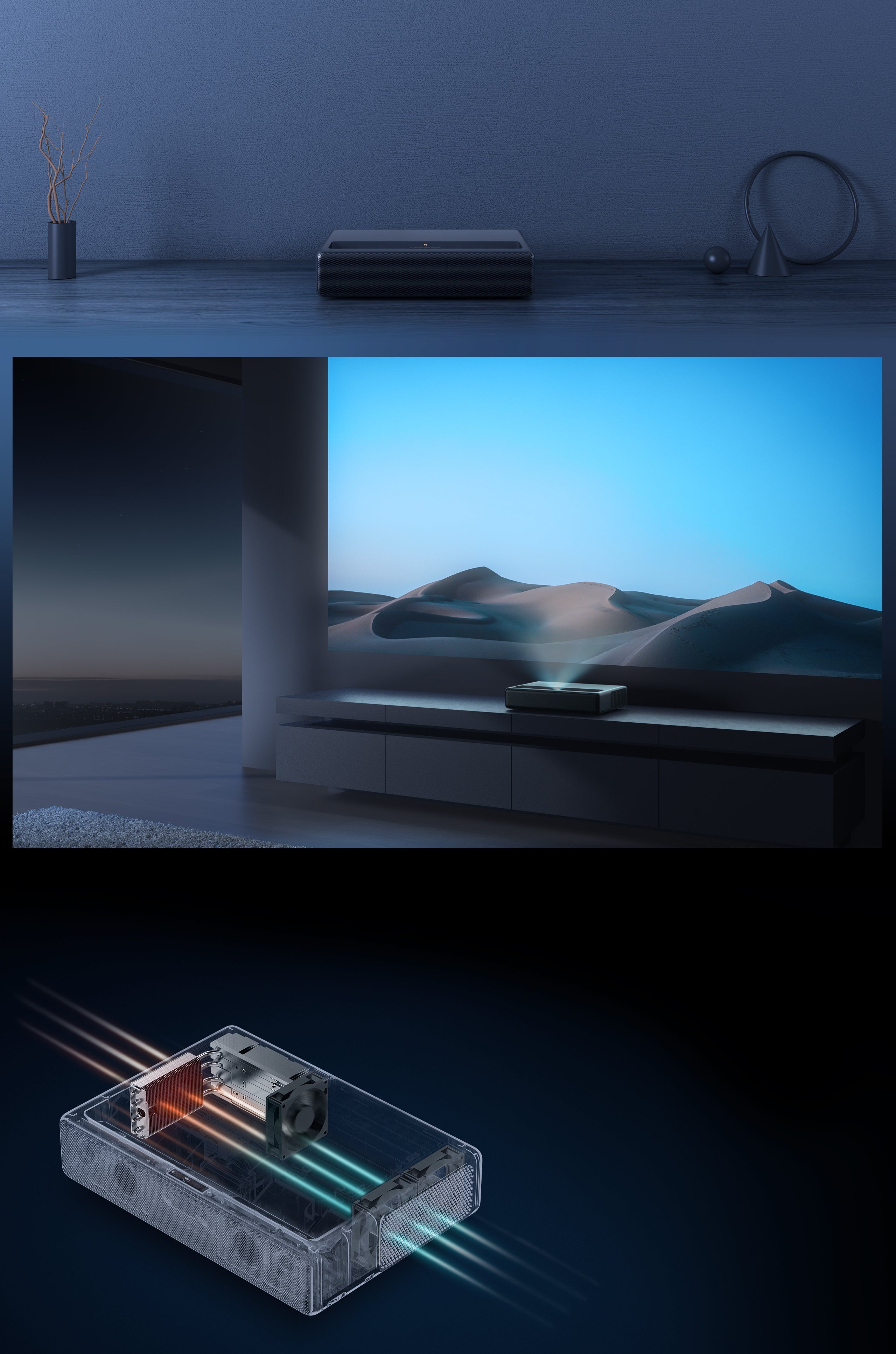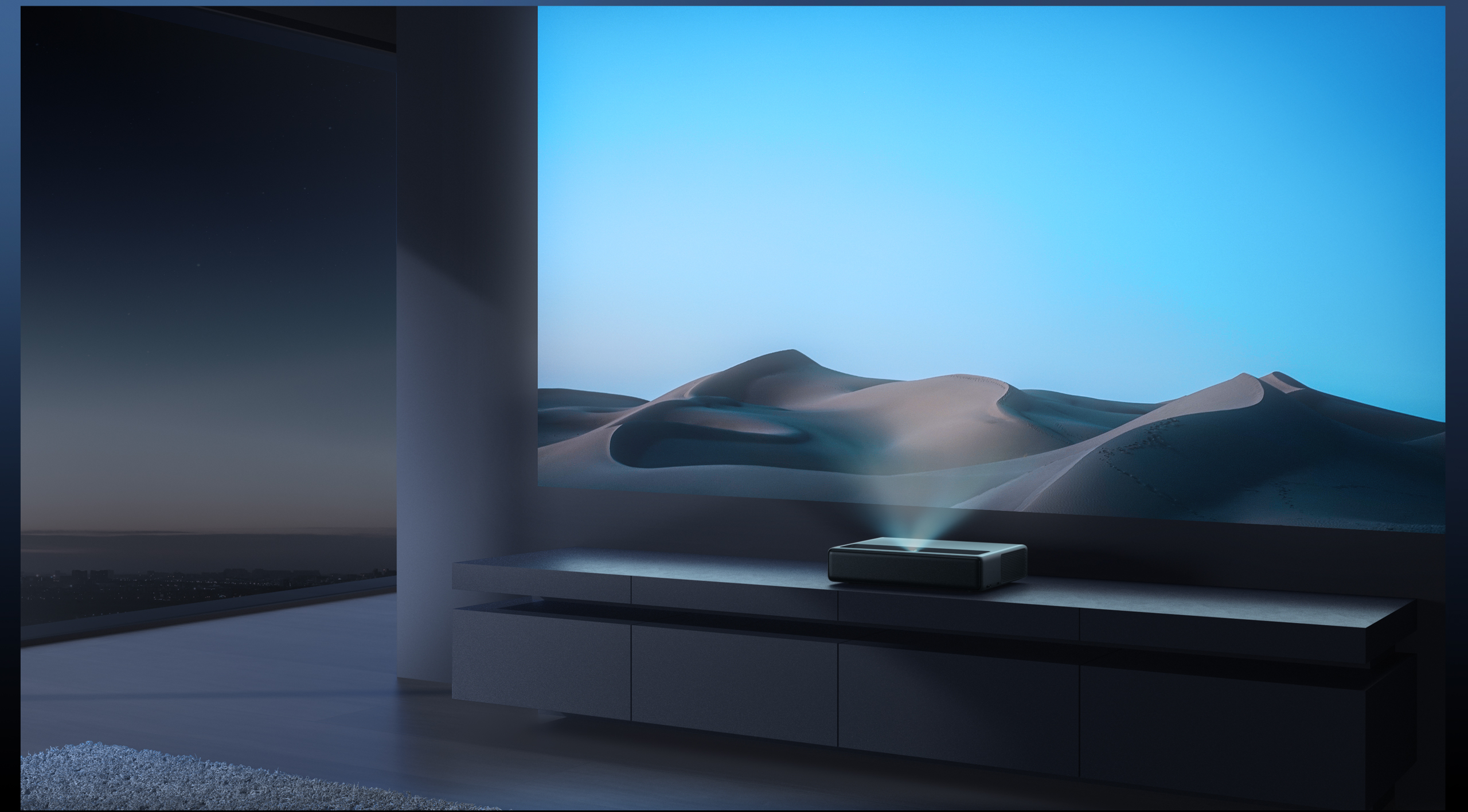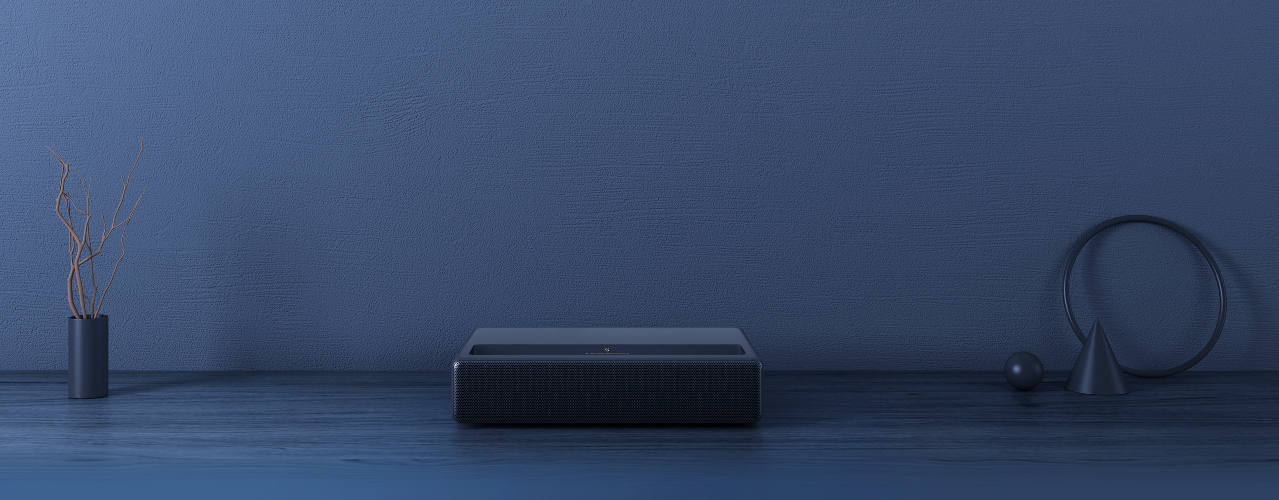 The Mi Laser Projector 4K can be placed on top of a TV cabinet to project 80–150"