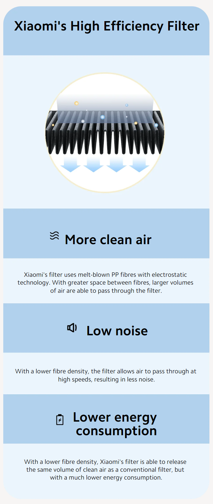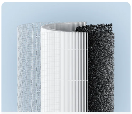 Combination of two filter technologies: Electrostatic and mechanical filtration. Xiaomi's High Efficiency Filter media can remove 99.97% of airborne particles as small as 0.1 micrometres and traps dust, PM 2.5, pollen, pet dander, smoke and even the smallest microplastics. The filtration rate of Xiaomi's High Efficiency Filter media is 99.97% for fine particles of up to 0.3 microns, and can reach up to 99.99% for particles as small as 0.1 microns.