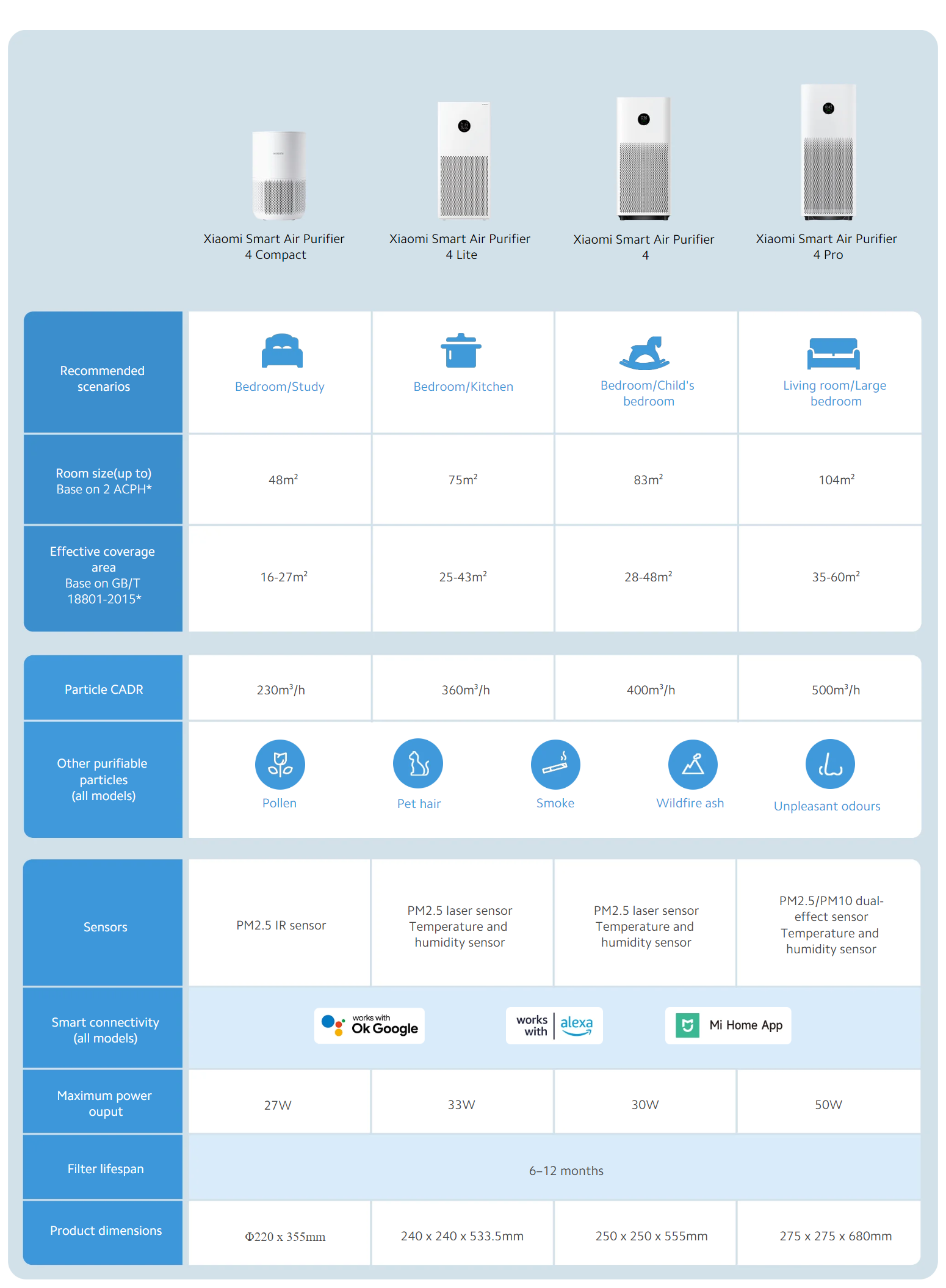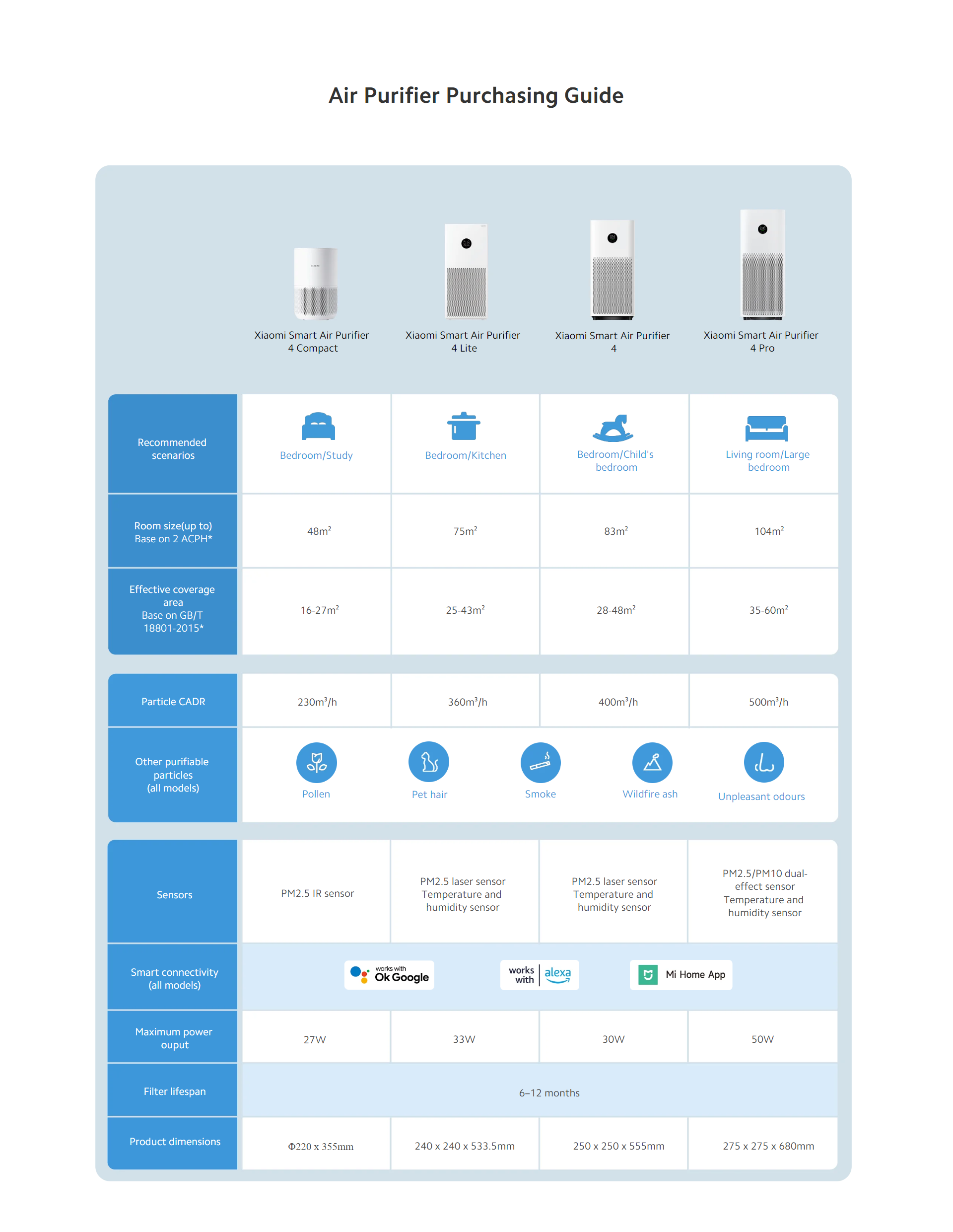 * Room size(up to) is calculated based on 2 air changes per hour(ACPH) and PCADR, meaning that it can purify a room of this size 2 times per hour(assuming the room has a ceiling height of 2.4 m), Room size = PCADR ÷ 2.4 m÷2.