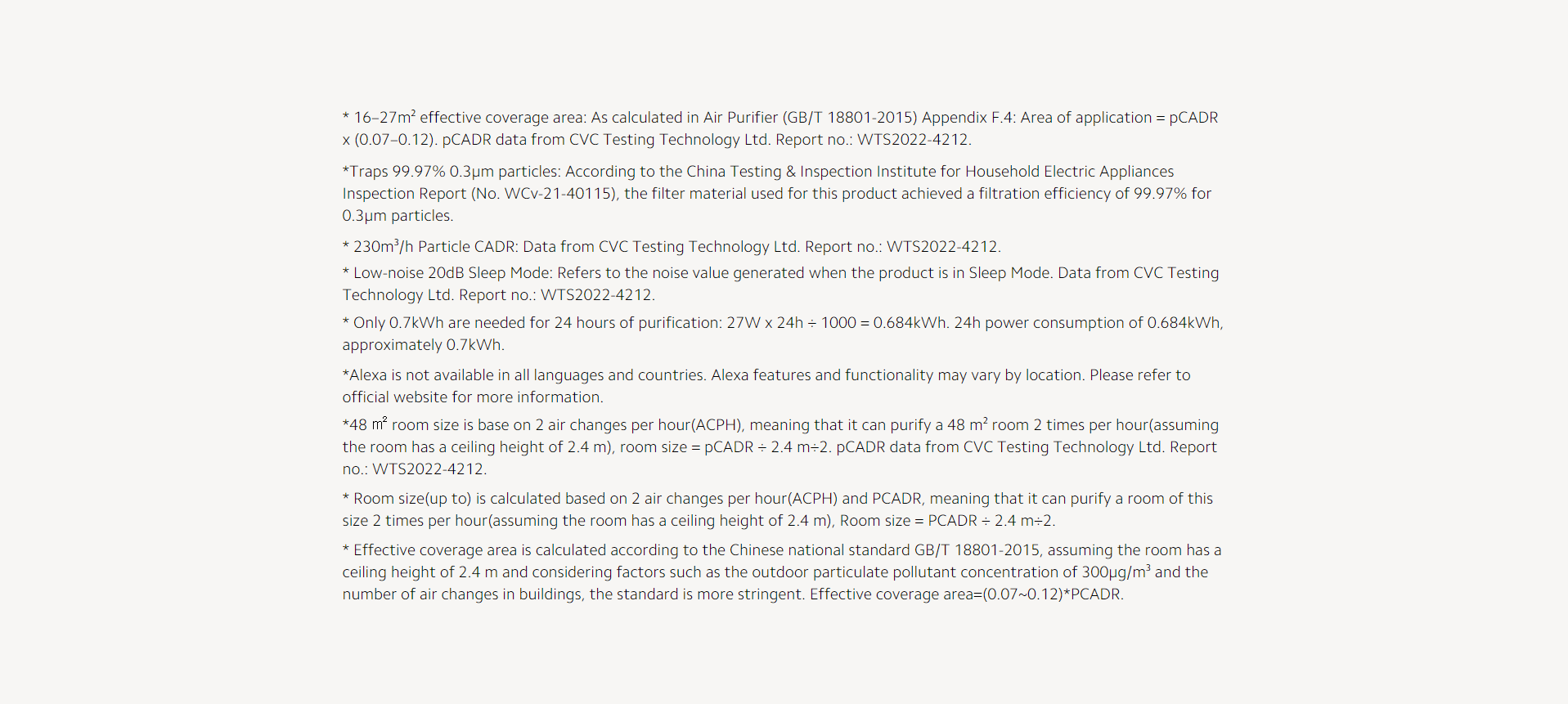 * 230m³/h Particle CADR: Data from CVC Testing Technology Ltd. Report no.: WTS2022-4212.