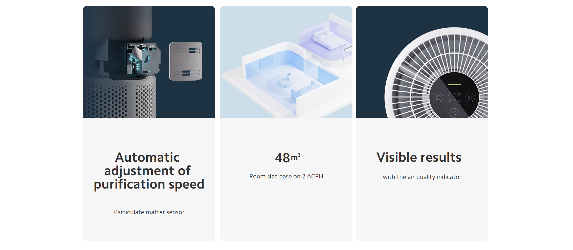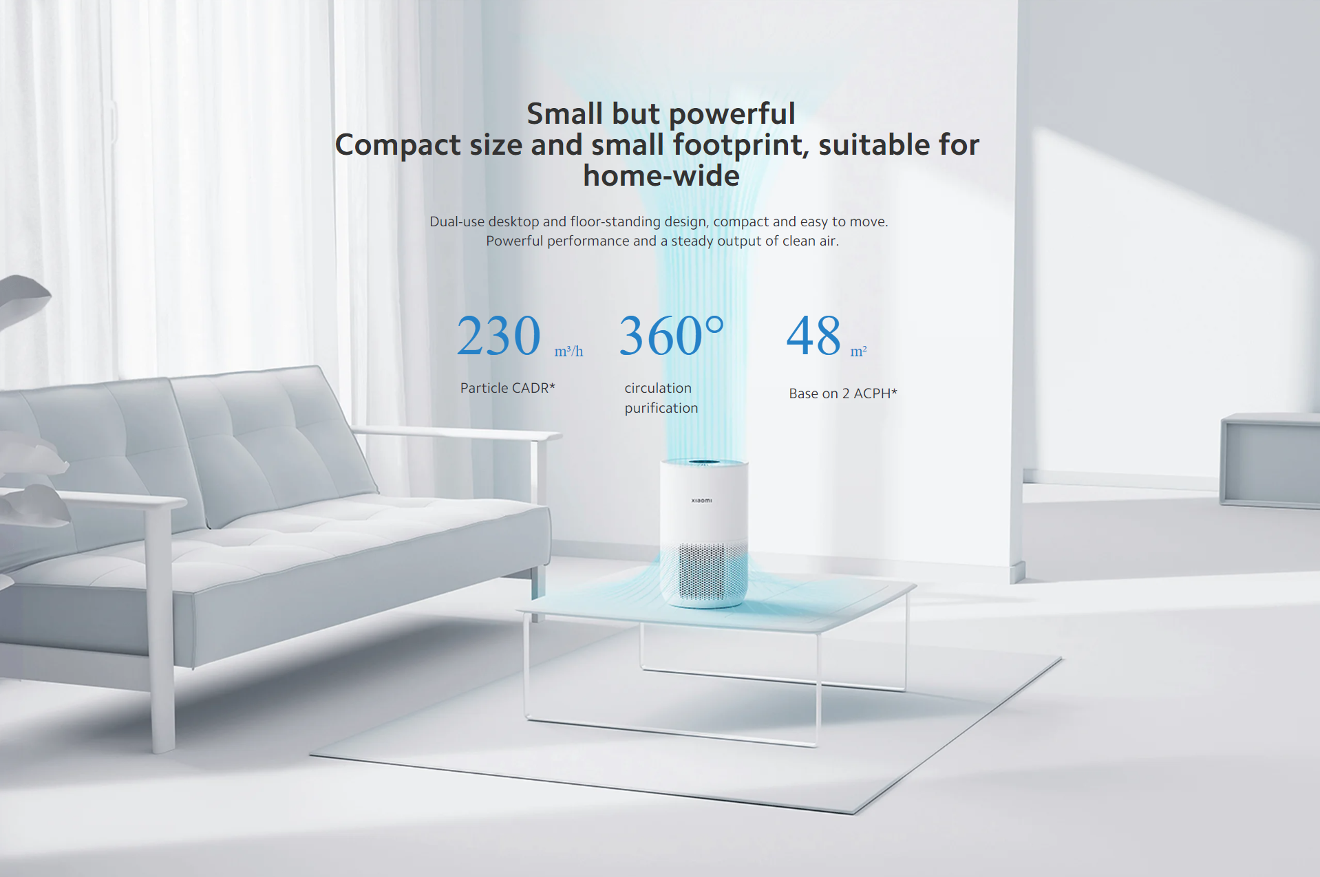 *48 ㎡ room size is base on 2 air changes per hour(ACPH), meaning that it can purify a 48 m² room 2 times per hour(assuming the room has a ceiling height of 2.4 m), room size = pCADR ÷ 2.4 m÷2. pCADR data from CVC Testing Technology Ltd. Report no.: WTS2022-4212.
