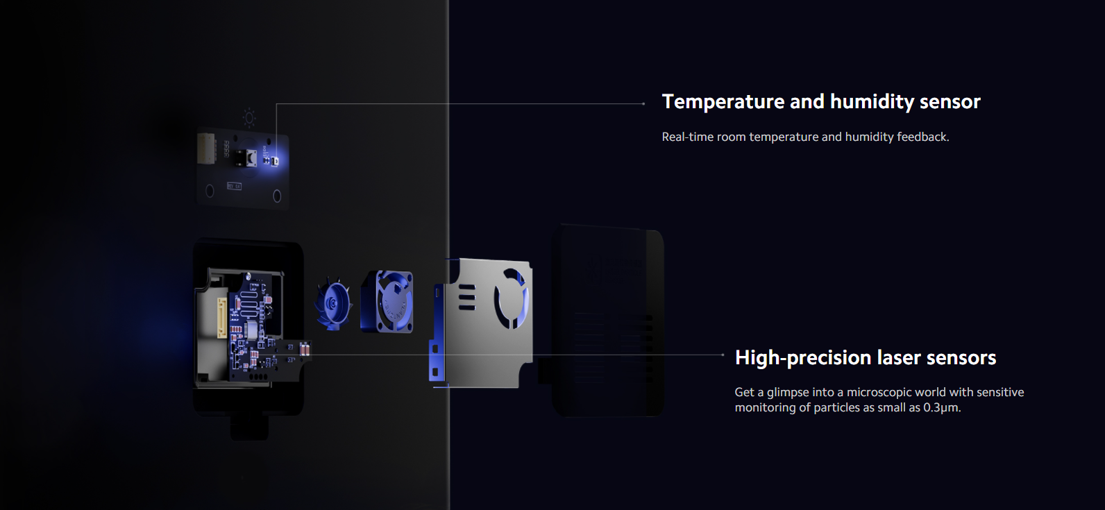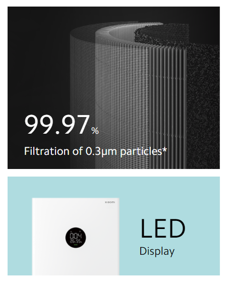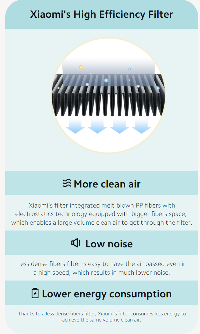 Combining two filter technologies: Electrostatic charge and mechanical filtration, Xiaomi's High Efficiency Filter media can remove 99.97% of airborne particles of 0.3 micrometers in size and traps dust, PM 2.5, pollen, pet dander, smoke and tiny particles. Compared to a conventional HEPA filter, Xiaomi's High Efficiency Filter allows the air purifier to generate less noise and consume less energy by allowing more airflow to pass through the filter all the while keeping the same cleaning efficiency.