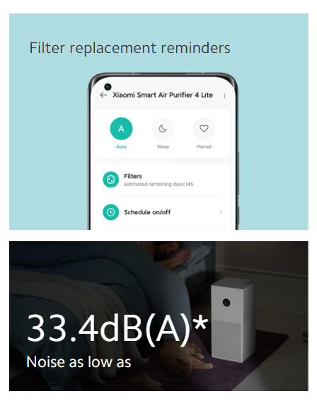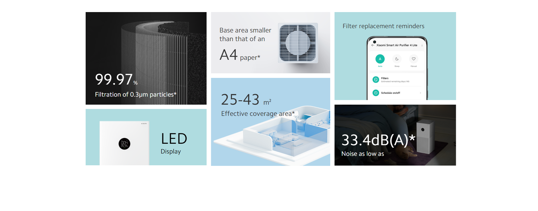 * High-efficiency filter paper for a larger surface area of 20,000cm²: The surface area of filter paper used on the high-efficiency filter of Xiaomi Smart Air Purifier 4 Lite is 20,000cm². Data from Smart Mi Lab, and may vary slightly due to differences between individual products.